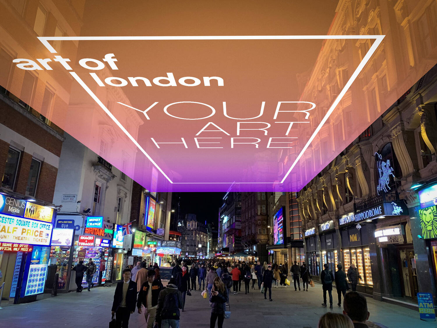 There are twelve eye-bolts attached to buildings down the street, from the Hippodrome down to the Vue Cinema. Annually utilised for Christmas lights, these provide an exciting opportunity to display above the busy street and for many the gateway into Leicester Square. This could take the form of canvases, lighting, lanterns or lightweight sculpts. All pieces will be subject to weight restrictions and wind calculations, so please consider this in your designs - no heavy sculptures! Structural engineers and experts will be consulted in the Ideas Lab and beyond so no need to go into that level of detail yet.