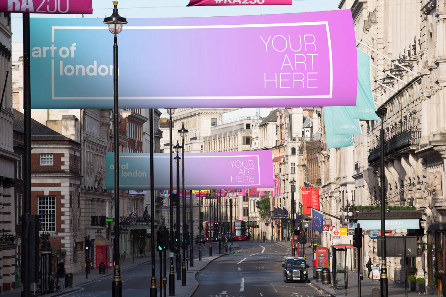 Piccadilly street sits between St James’s and Mayfair and is home to some of the world’s most iconic retail stores. The energetic atmosphere in this area is sustained all year round with the thriving footfall from both Londoners and tourists alike. This famous road is home to hanging canvases and is regularly used as a blank canvas for the creative arts.