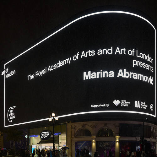 On Friday 13th of October, an exclusive screening inspired by Marina Abramović's art featured on the iconic Piccadilly Lights, coinciding with her major autumn exhibition at the Royal Academy of Arts.