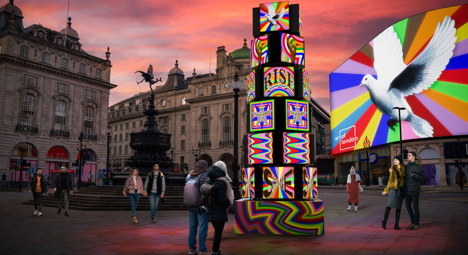 Evoking the spectacle and collective exhilaration of a live music festival, internationally acclaimed, London-based artist Lakwena Maciver (Tate Britain, Southbank Centre, Somerset House) will launch the programme with Rise and Shine: a landmark, 7-metre-tall tower constructed from stacked disco lightboxes. Installed at Piccadilly Circus, one of the world’s most inconic locations – it emphasises the location as both a stage and gathering point.