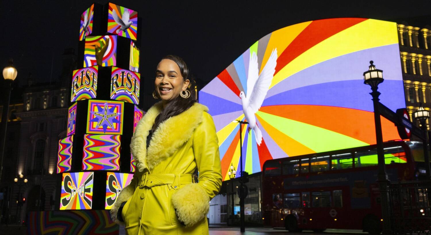 Evoking the spectacle and collective exhilaration of a live music festival, internationally acclaimed, London-based artist Lakwena Maciver (Tate Britain, Southbank Centre, Somerset House) has launched the programme with Rise and Shine: a landmark, 7-metre-tall tower constructed from stacked disco lightboxes. Installed at Piccadilly Circus, one of the world’s most iconic locations – it emphasises the location as both a stage and gathering point.
