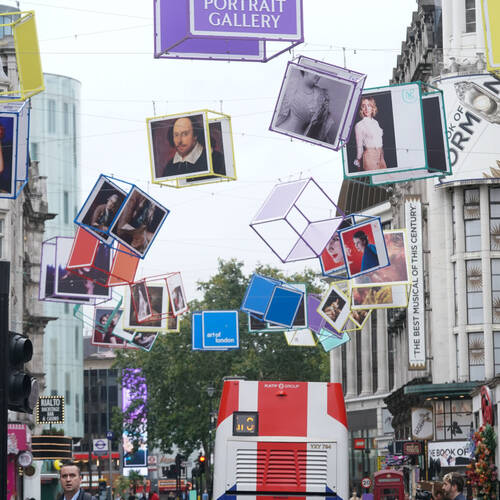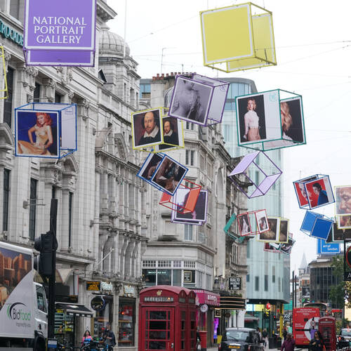 To kick off our summer season, actor and art enthusiast Russell Tovey unveiled ‘Art Reframed’. This captivating installation features some of the National Portrait Gallery's most celebrated portraits displayed on over 50 giant colourful cubes, lining the skies of London's lively entertainment district.