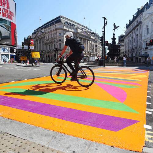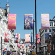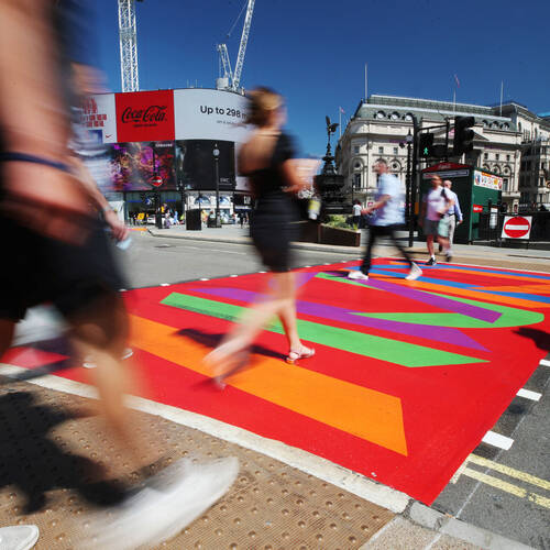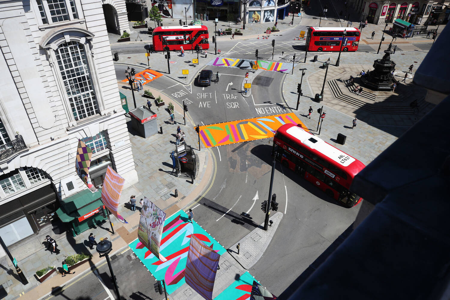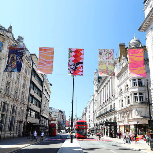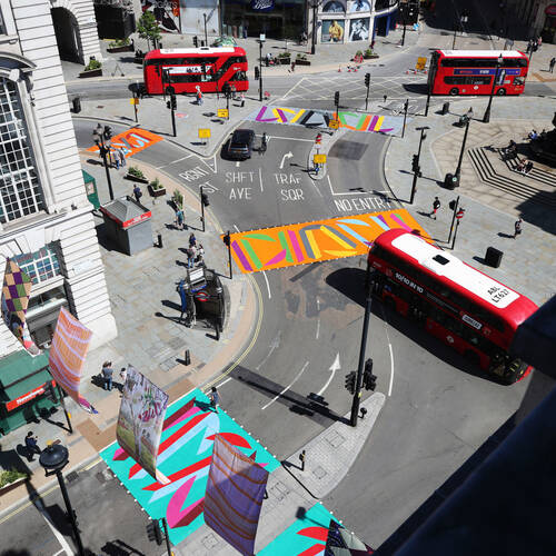 From 21 July - 24 September 2021, the area around Piccadilly will be transformed by 30 overhanging flags, 13 pedestrian crossings, as well as regular art takeovers of the internationally recognisable screens, known as Piccadilly Lights.