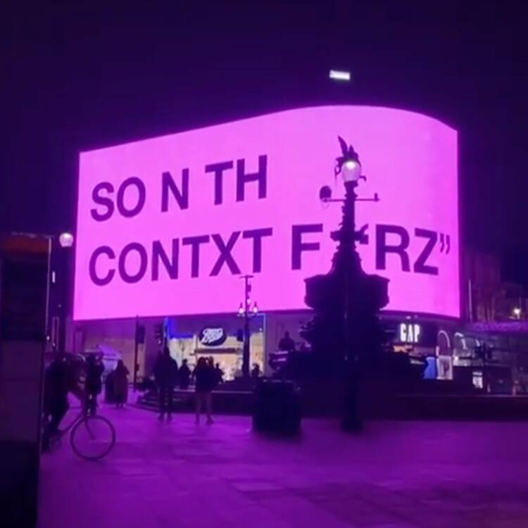 Displaying on the Piccadilly Lights in Piccadilly Circus at c:20:21 GMT every evening, American visual artist Tony Cokes will broadcast four powerful new films confronting police violence and the questions we face in the post-pandemic era.
