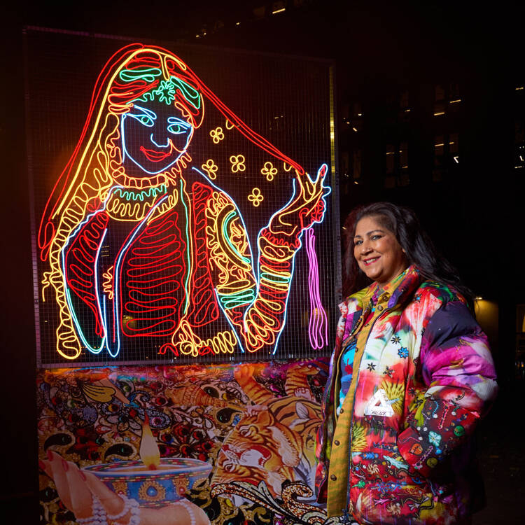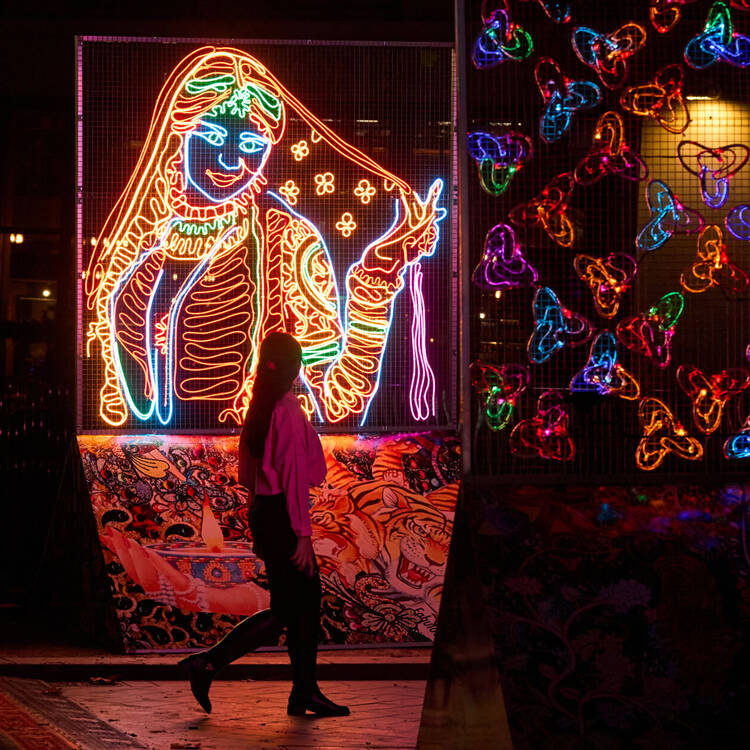 Take a walk through Leicester Square Gardens and be amazed by the bright neon creations by mixed media artist Chila Kumari Singh Burman MBE.