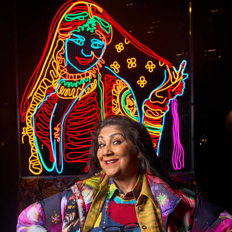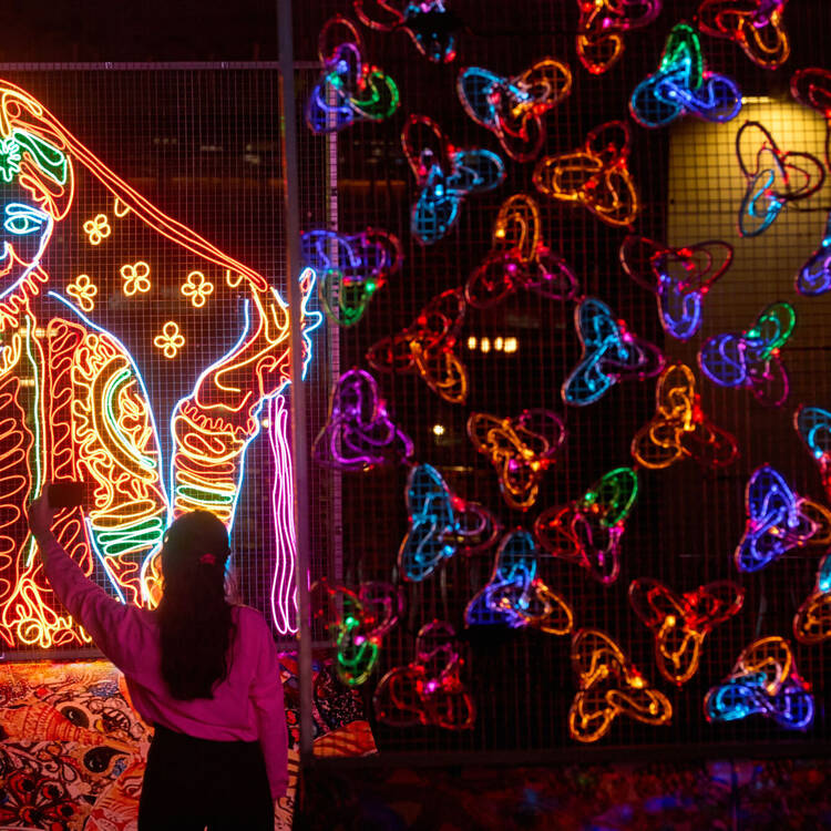 Stroll through Leicester Square Gardens and be mesmerised by the colourful neon installations from mixed media artist Chila Kumari Singh Burman MBE. Known for her bold work that explores themes of identity, gender, and culture, Burman’s new piece created for Art After Dark is a must-see.