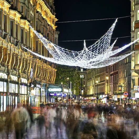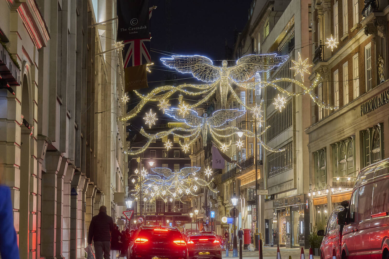 Lit up with a series of unique glistening angels which cascade down the famous street surrounded by stars and factoring in a mixture of glittering blues and gold lights to bring together traditional and classic Christmas look.