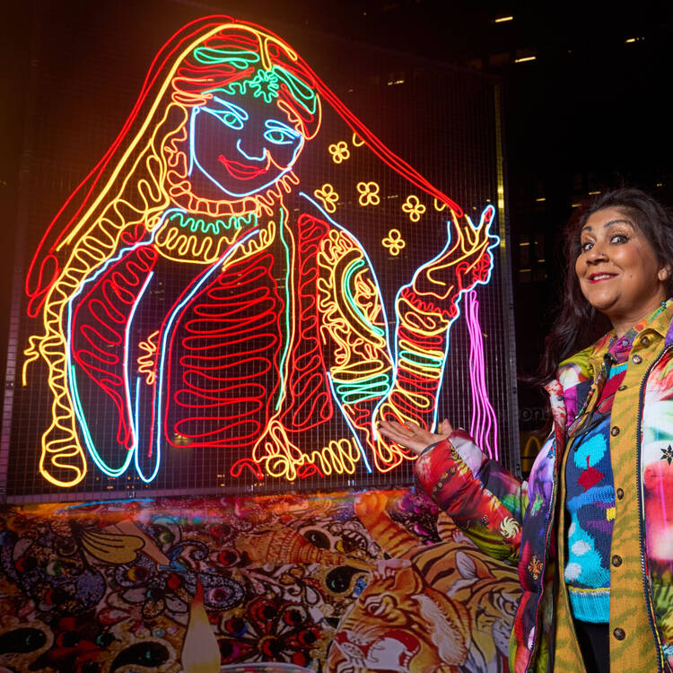 Visit Leicester Square Gardens, where you’ll be greeted by the vibrant neon art of Chila Kumari Singh Burman MBE. Her stunning installations light up the West End, featuring a brand-new piece created just for Art After Dark.