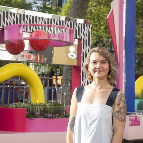 Sam created immersive environments through her work, encouraging people to ‘find their play’. Williams’ lively creation entitled 'Catch Me If You Can' drew on her childhood experience of growing up in a theme park and used colourful patterns that encouraged people to experience the world through a new lens, enhanced with a fun augmented reality game.