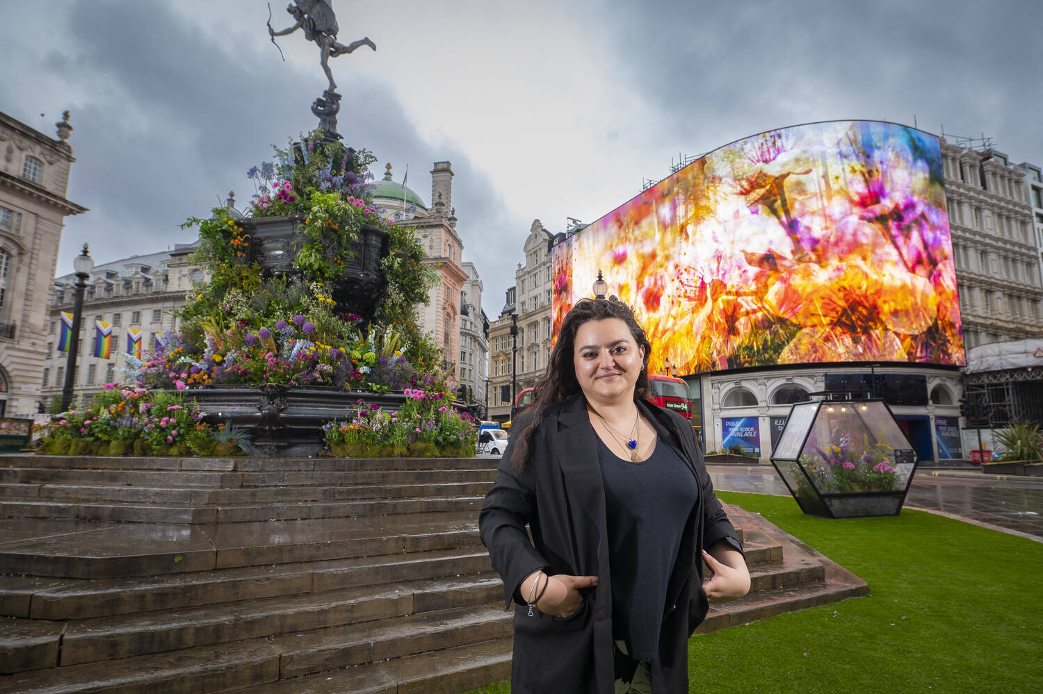 Transforming Piccadilly Circus after dusk for Art After Dark in June of 2023 was visual artist Amelia Kosminsky. Amelia created a striking video art piece titled ‘Sparks of Nature’, featured on Europe’s largest advertising screen, Piccadilly Lights.