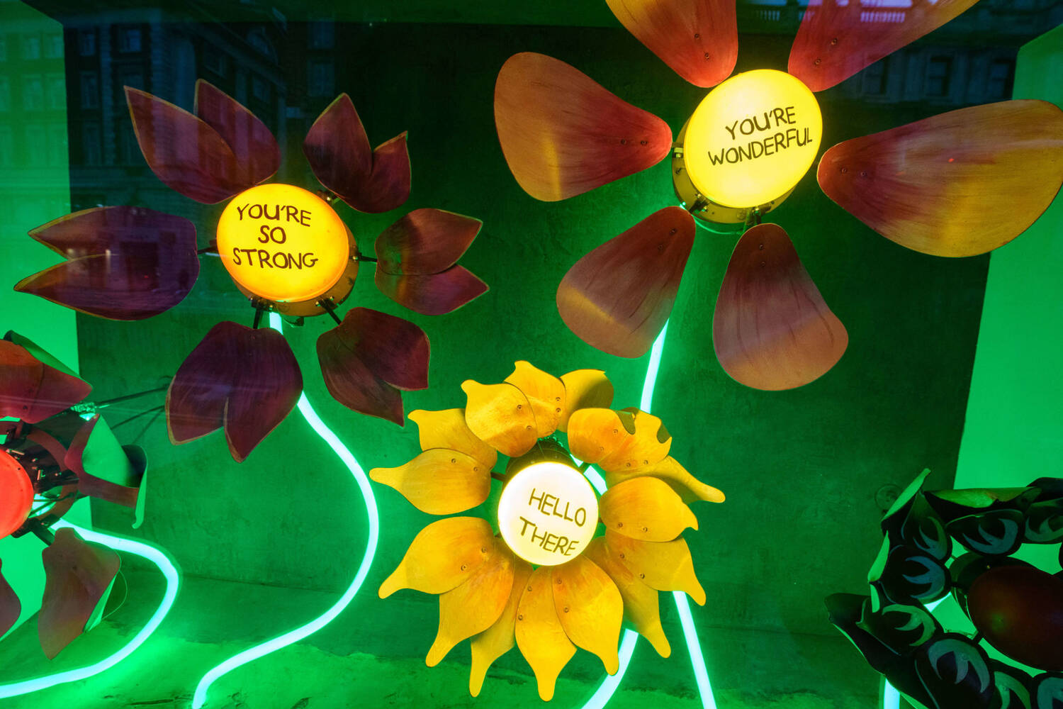 "My window seeks to combine the joy of seeing blossoming flowers with the joy of receiving a compliment. I thought about how much bad news we have had to absorb this year, and I wanted a way of counteracting this by delivering good news.