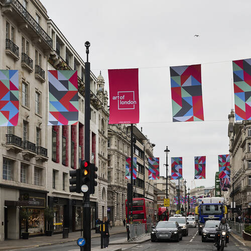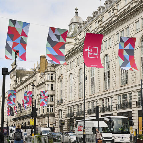We are thrilled to announce a brand new public art flag display on Piccadilly in collaboration with the Royal Academy of Arts and renowned artist Rana Begum. The vibrant designs entitled No.1273 Flag will adorn the London skies from 30th May to 20th August 2023.