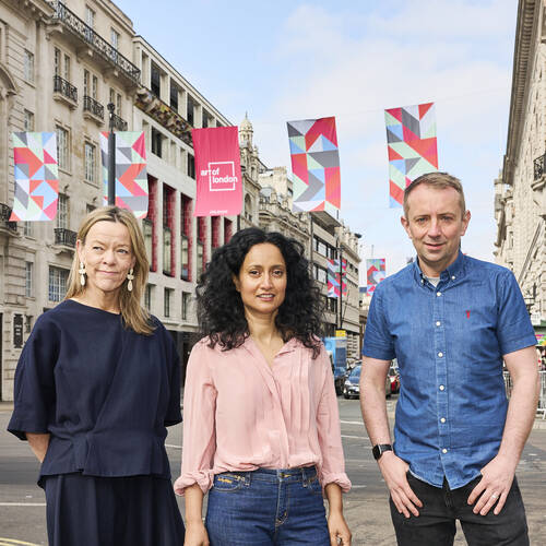 Designed by Rana Begum, these flags are a nod to the beginning of the upcoming Art of London Summer Season, created in response to ‘The Art of Entertainment’ our theme for 2023.