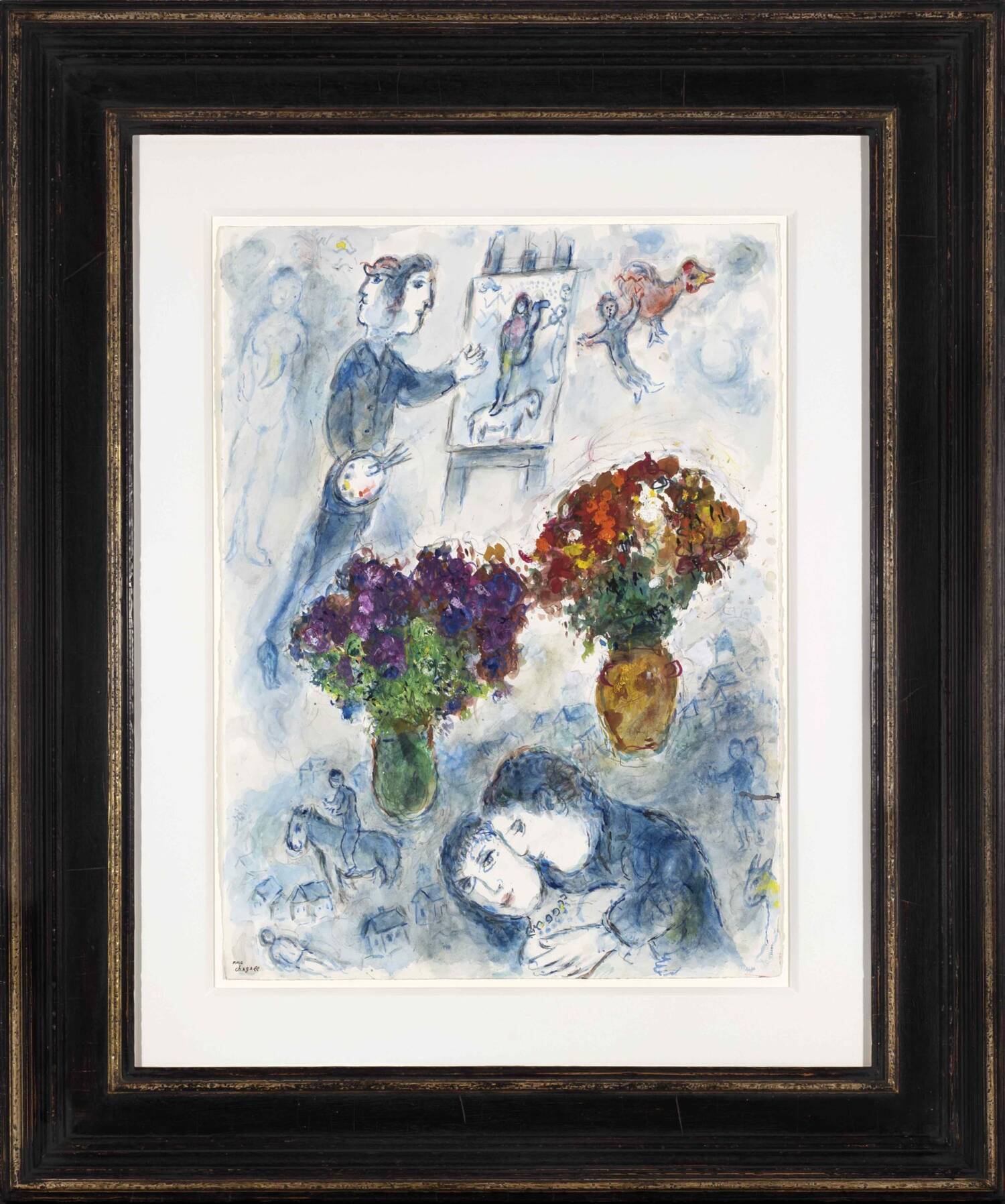 Caption: Marc Chagall, Les amoureux aux deux bouquets et le peintre, gouache, oil, tempera, coloured pencils and pastel on paper, 76.4 x 56.6 cm (30 ¹/₈ x 22 ¹/₄ inches), painted circa 1975. Copyright line: Stern Pissarro Gallery, London